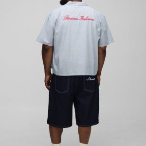Plus Oversized Boxy Revere Linen Look Apres Tennis Embroidered Shirt