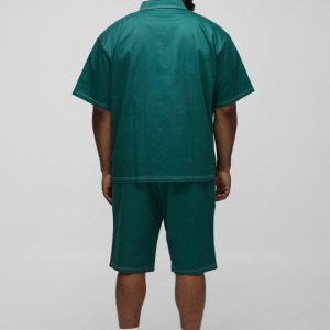 Plus Twill Contrast Stitch Embroidered Short Sleeve Shirt Jacket