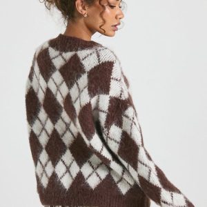 Premium Super Soft Brushed Knit V Neck Argyle Oversized Jumper