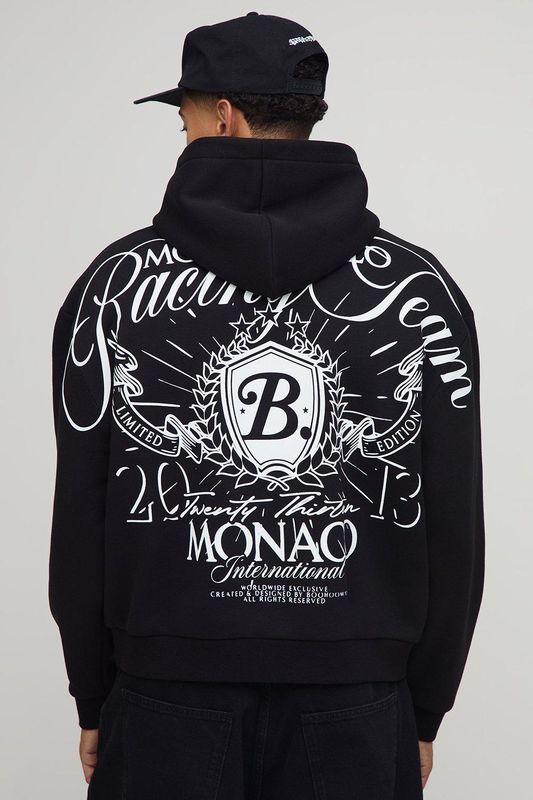 Black Oversized Boxy Over Seam Racing Team Printed Hoodie