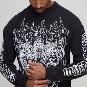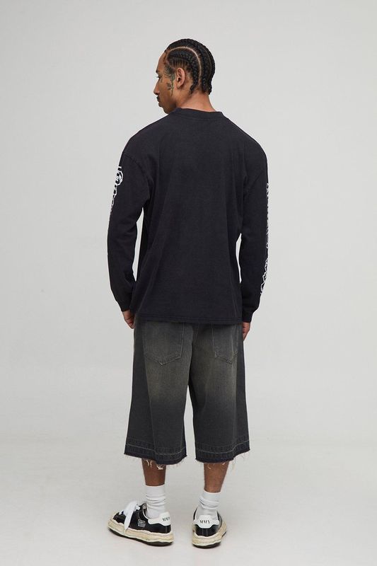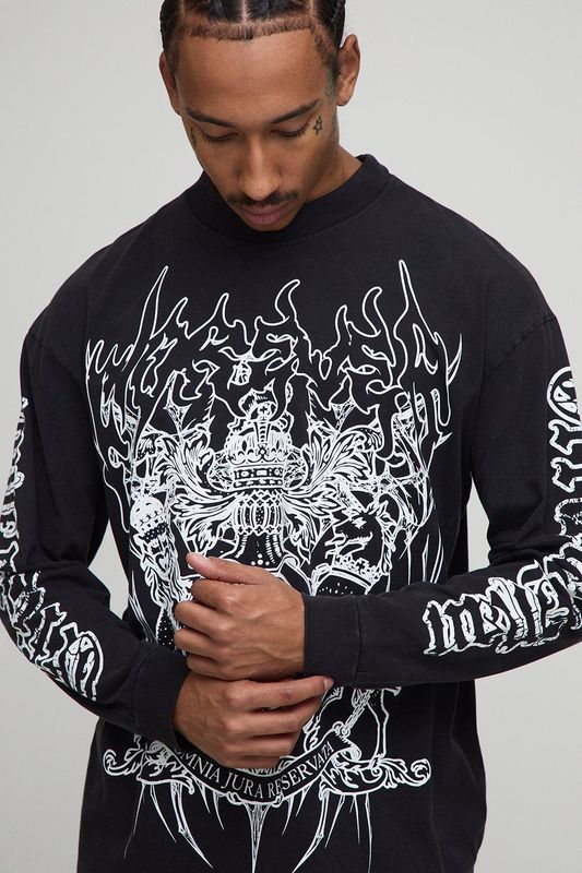 Black Oversized Extended Neck Washed Gothic BM Crest Long Sleeve T-Shirt