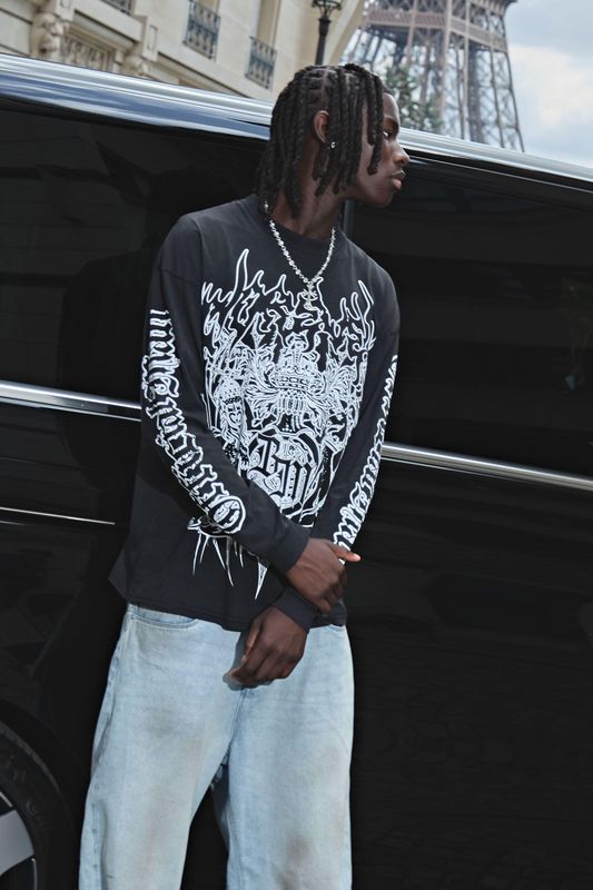 Black Oversized Extended Neck Washed Gothic BM Crest Long Sleeve T-Shirt