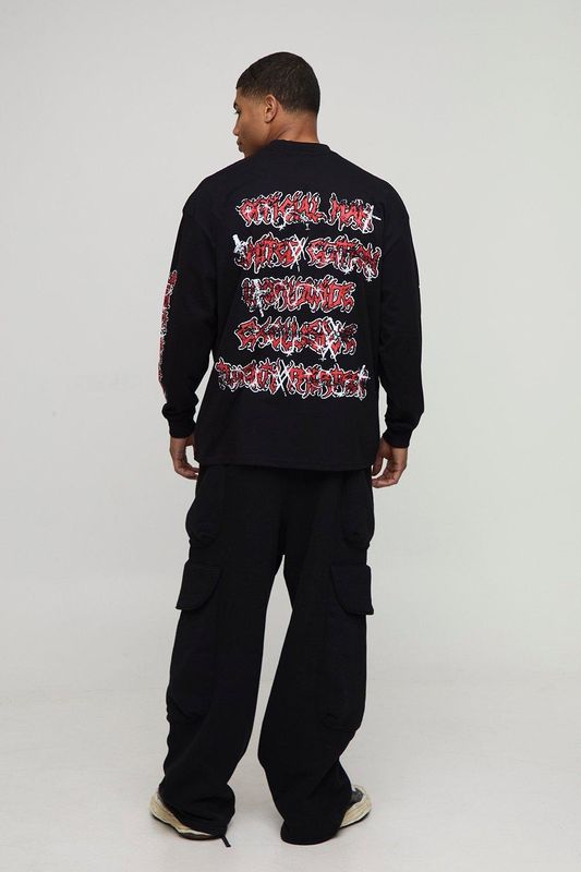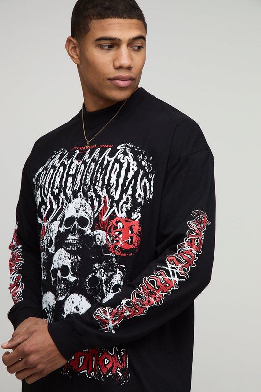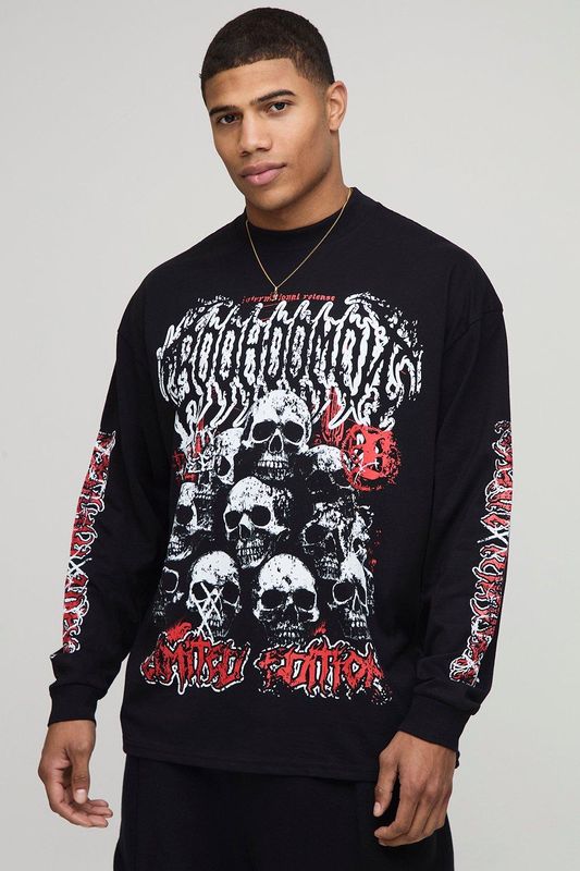 Black Oversized Long Sleeve Skull Printed Graphic T-Shirt