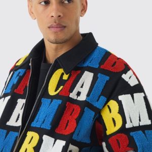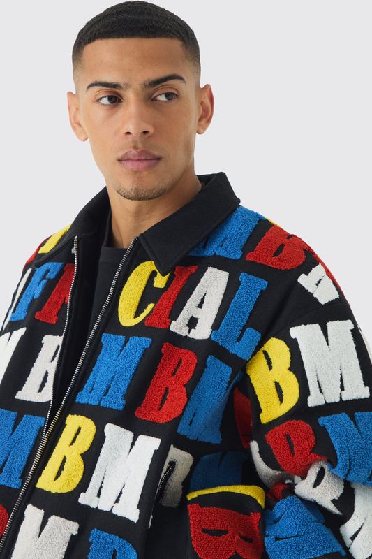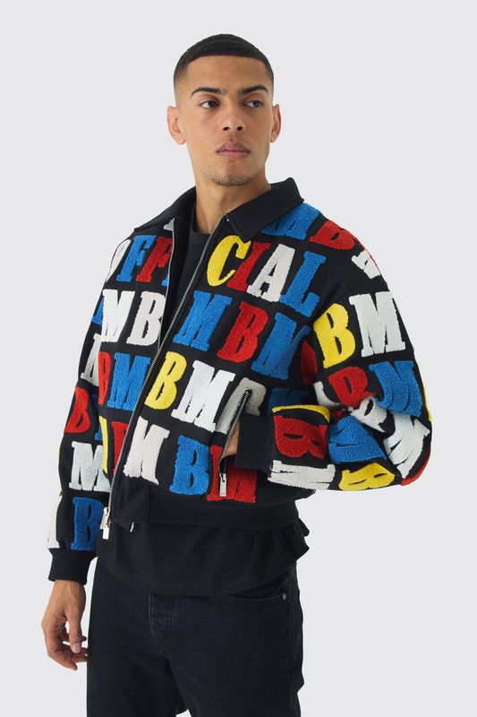 Boxy Letter Badge Collared Varsity Jacket In Black