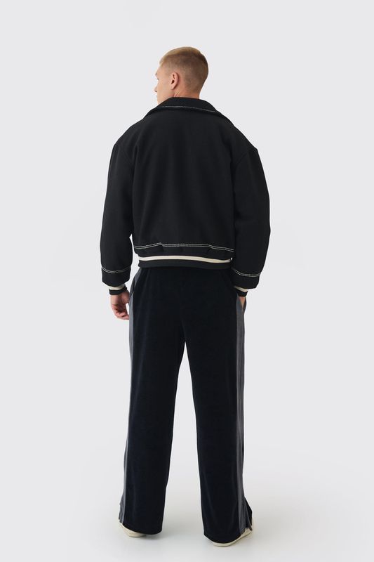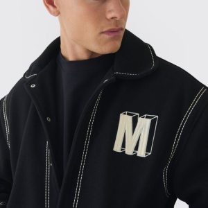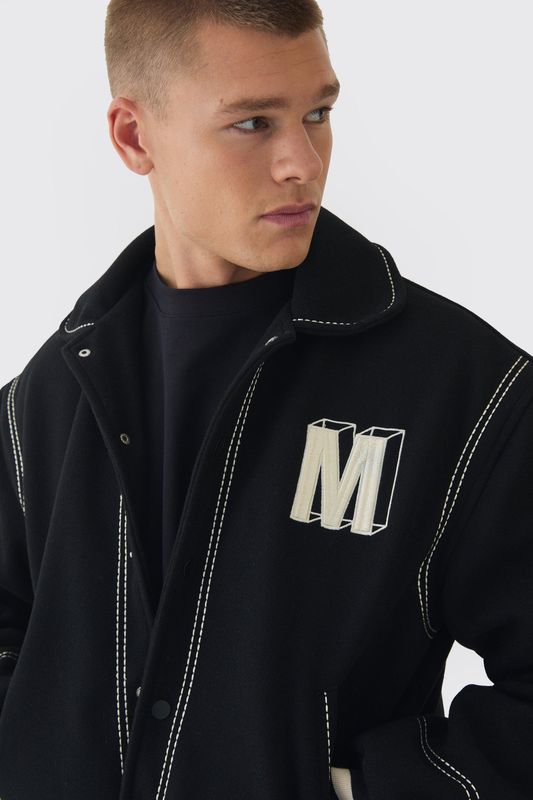 Boxy Stitch Detail Melton Varsity Jacket In Black