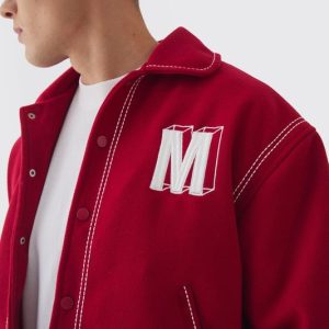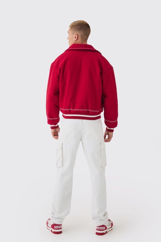 Boxy Stitch Detail Melton Varsity Jacket In Red