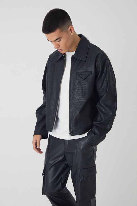 Leather has never been out of style, and now you can enjoy the look, feel and texture of leather with a clear conscience by choosing our men’s faux leather jackets. Made from synthetic materials, these imitations carry all the style and elegance of the original but are much tougher and come in a greater variety of shades and patterns. Try a panelled moto jacket with skinny jeans and boots for an edgy trackside look, or a boxy biker jacket with contrasting stitch for a more vintage feel. Or choose a classic black in matte, shiny or embossed finish to give any outfit an instant upgrade.