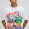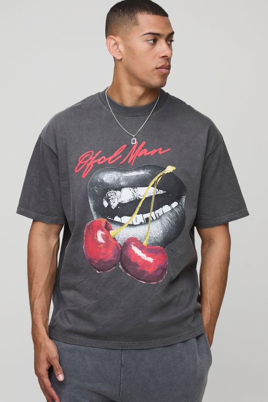 Charcoal Oversized Extended Neck Washed Cherry Lips Graphic T-Shirt