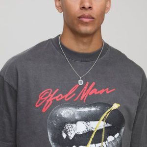 Charcoal Oversized Extended Neck Washed Cherry Lips Graphic T-Shirt