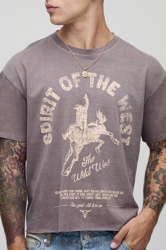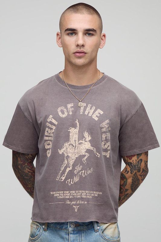 Chocolate Shrunken Boxy Western Raw Hem Washed Graphic T-Shirt