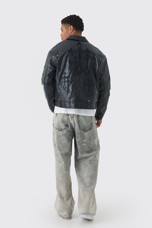 Cross Applique PU Bomber Jacket In Black