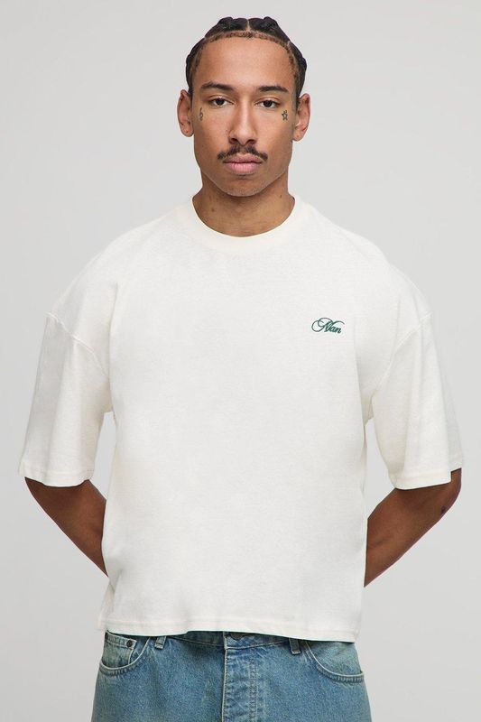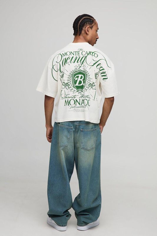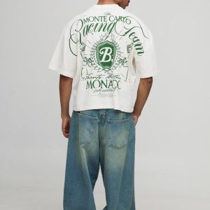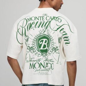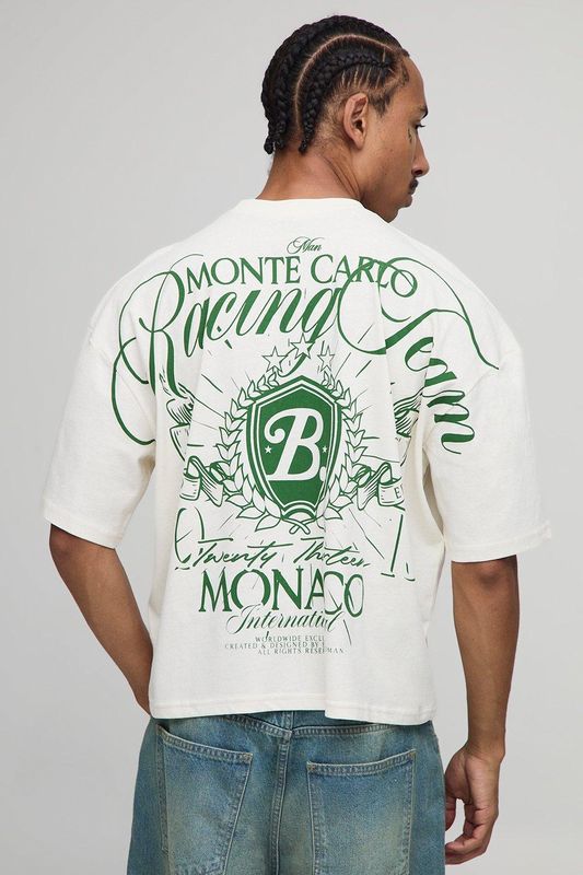 Ecru Oversized Shrunken Boxy Over Seam Racing Team Printed T-shirt