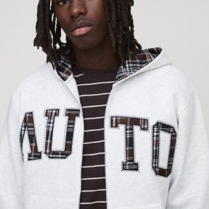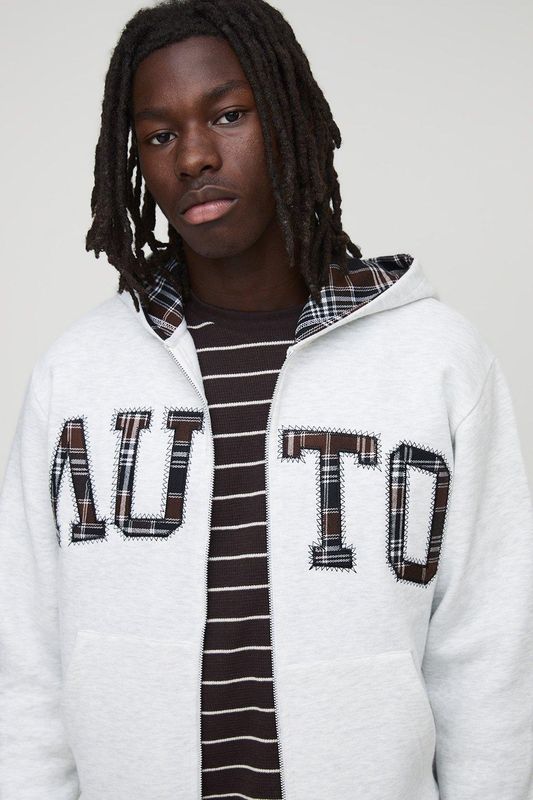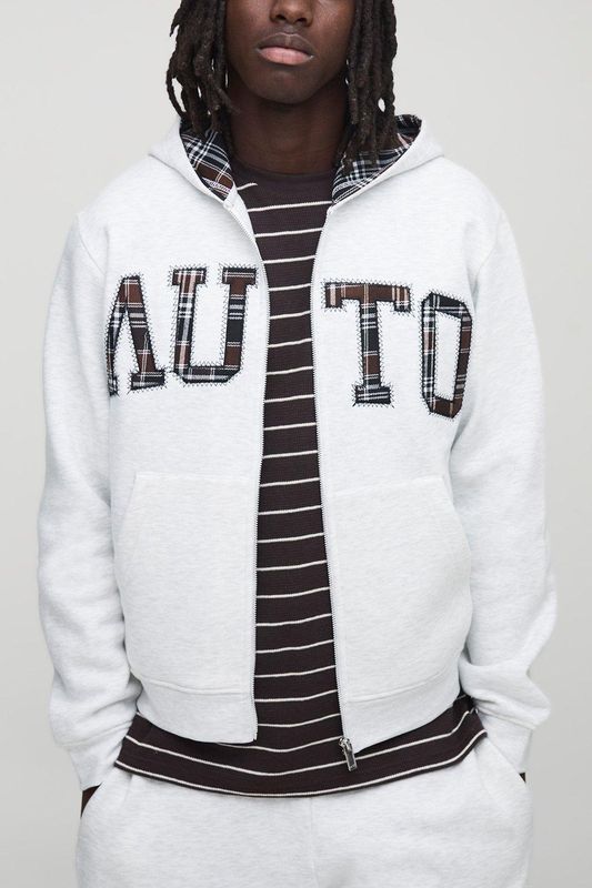 Grey Check Applique Zip Through Hoodie