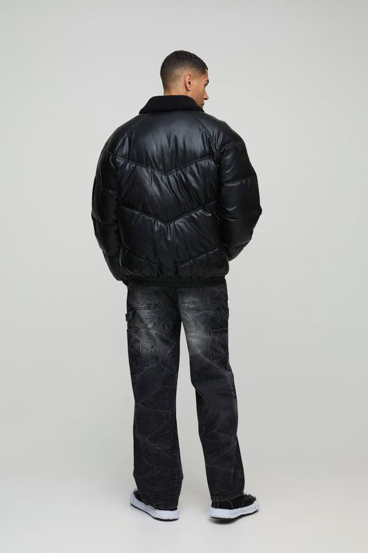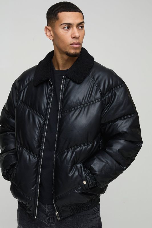 Oversized Borg Collar PU Puffer Jacket