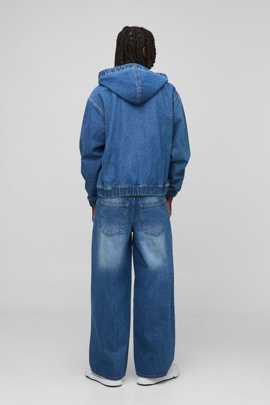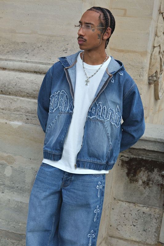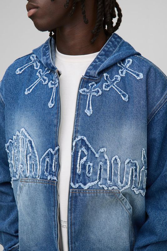 Oversized Boxy Cross Applique Washed Denim Hoodie
