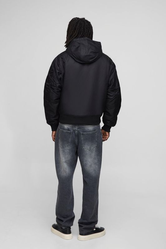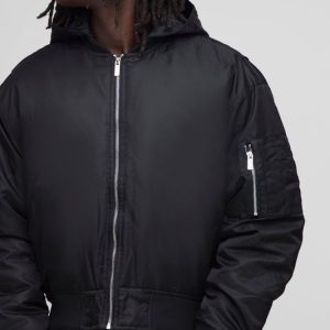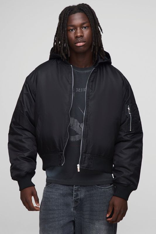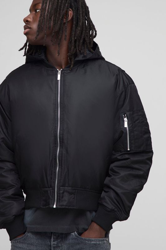 Oversized Boxy Curved Hem Hooded Nylon Bomber Jacket