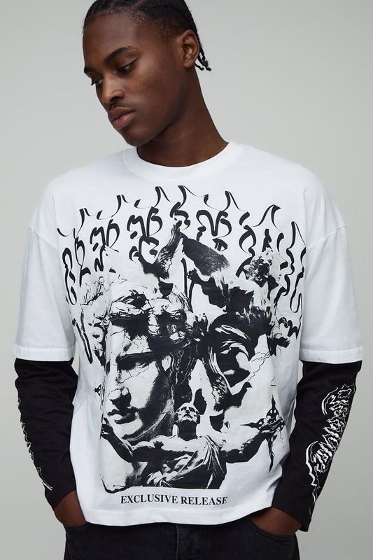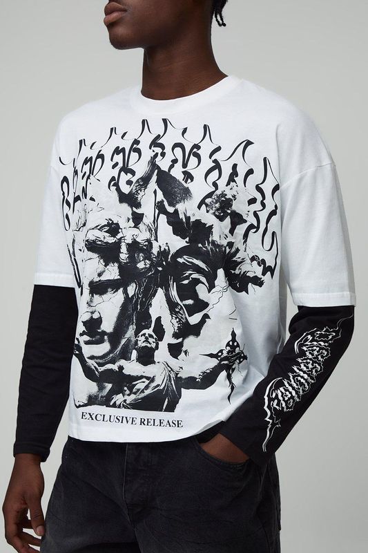 Oversized Boxy Faux Layer Gothic Printed Long Sleeve T-Shirt