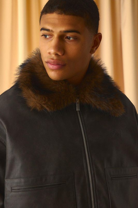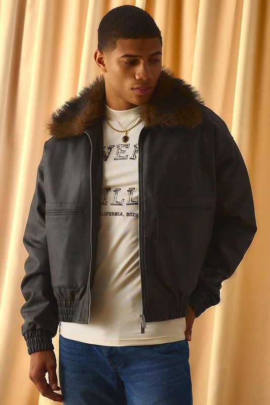 Oversized Boxy Fit Antique PU Bomber with Faux Fur Collar