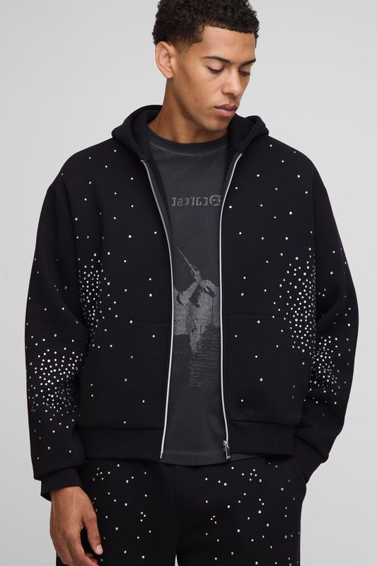 Oversized Boxy Rhinestone Zip Through Hoodie