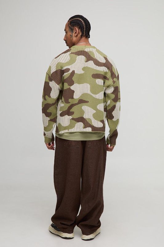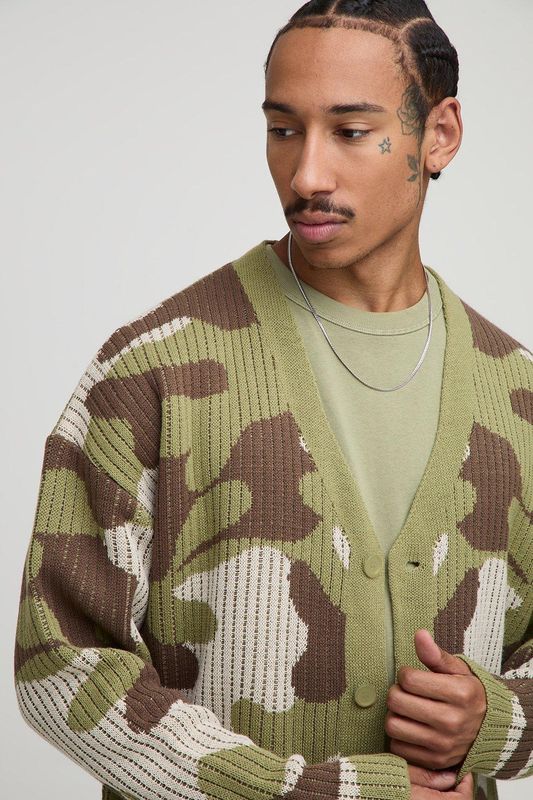 Oversized Boxy Ribbed Camo Knitted Cardigan