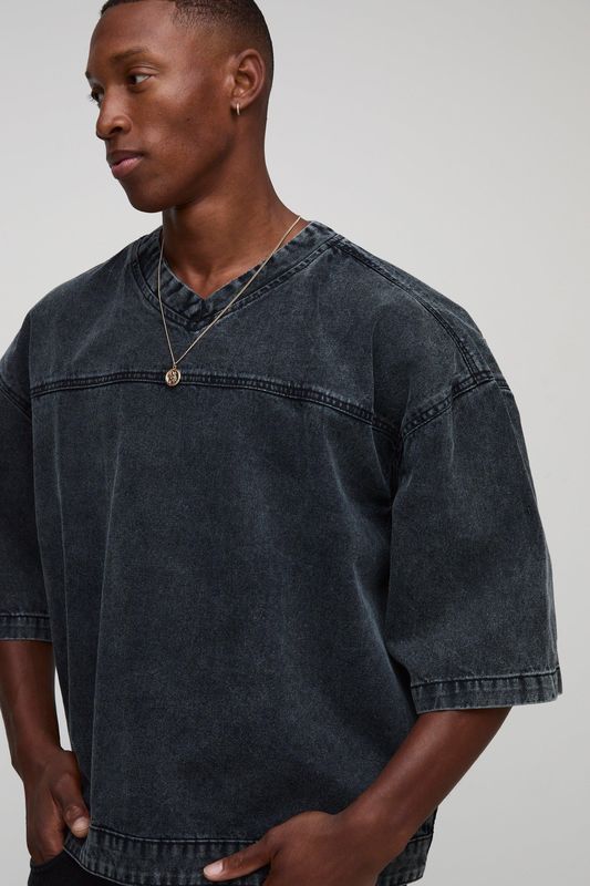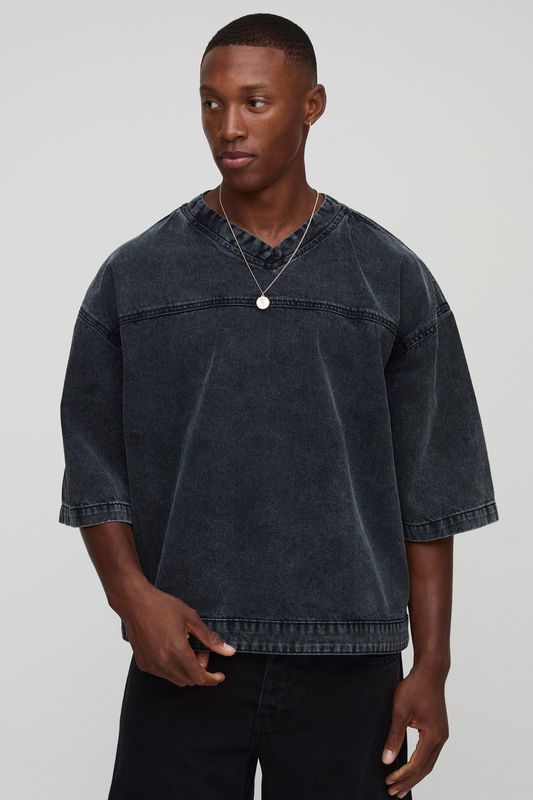 Oversized Boxy V Neck Denim Hockey T-Shirt