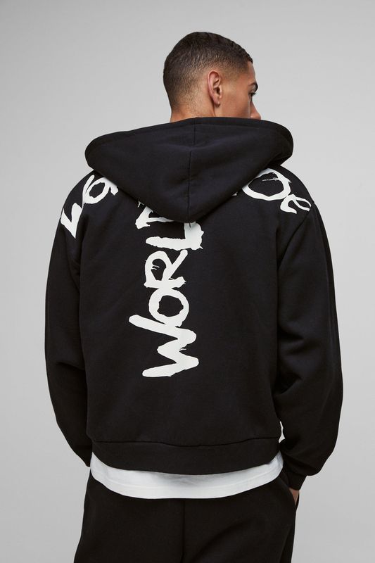 Oversized Boxy Zip Through Worldwide Graffiti Print Zip Through Hoodie