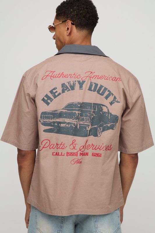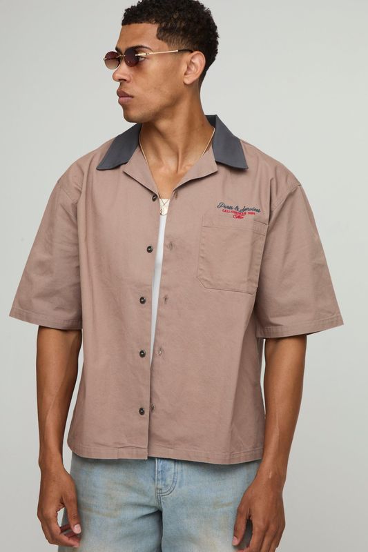 Oversized Embroidered Contrast Collar Washed Revere Shirt