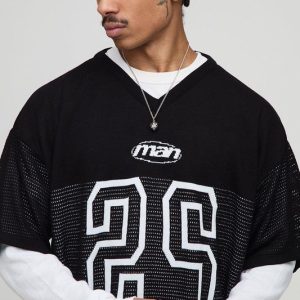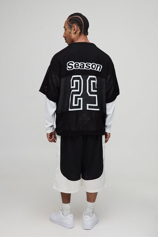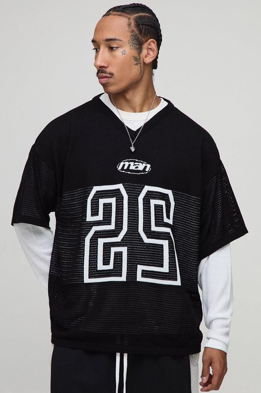 Oversized Faux Sleeve Open Stitch Varsity Hockey Knitted T-Shirt
