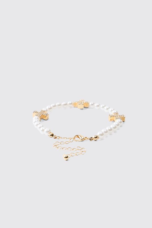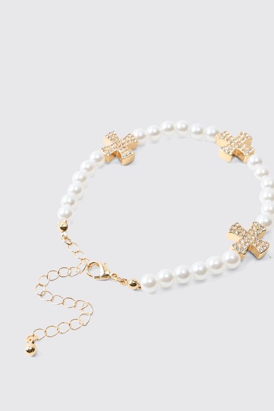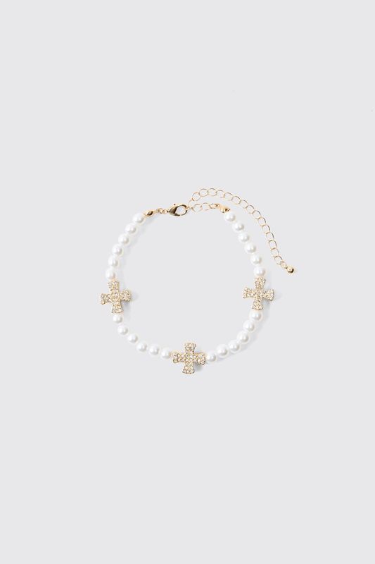 Pearl Bracelet With Iced Cross Charms
