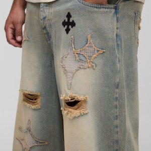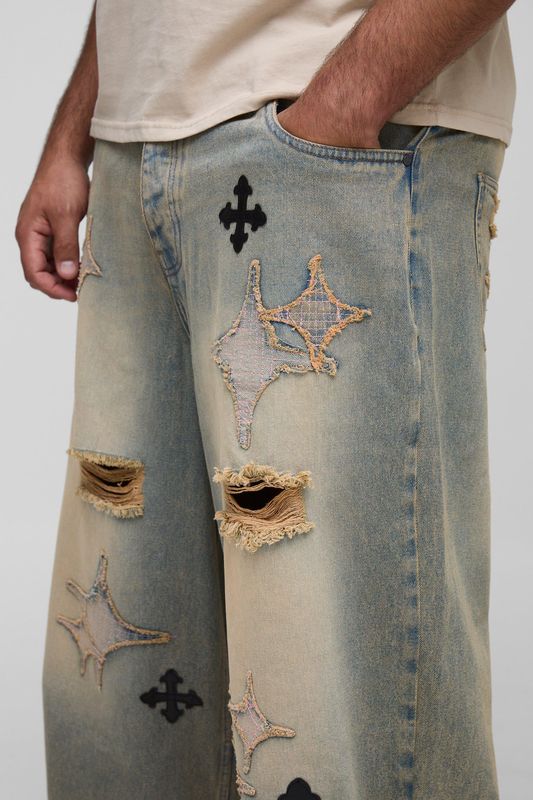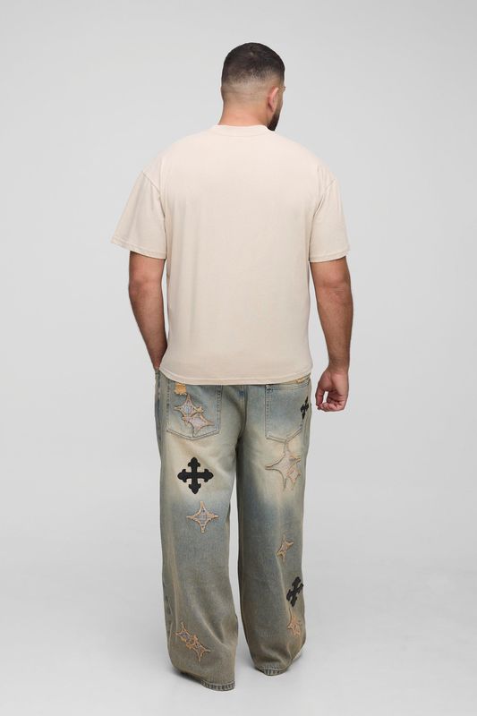 Plus Distressed Applique Tinted Baggy Fit Jeans