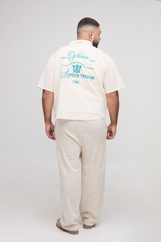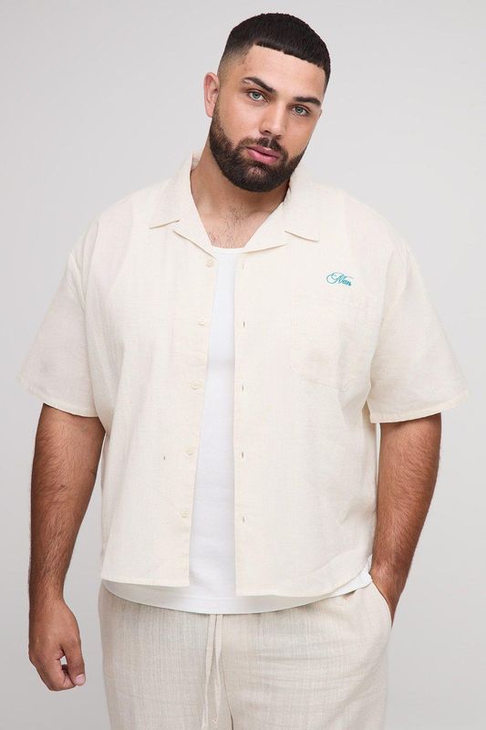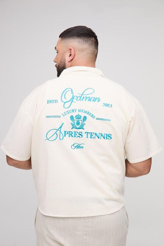 Plus Oversized Boxy Revere Linen Look Apres Tennis Embroidered Shirt
