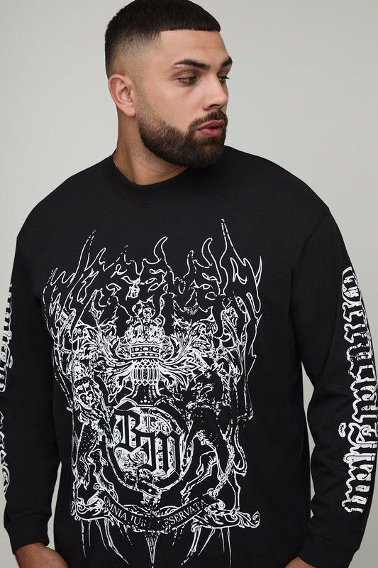 Plus Oversized Extended Neck Gothic BM Crest Long Sleeve T-Shirt