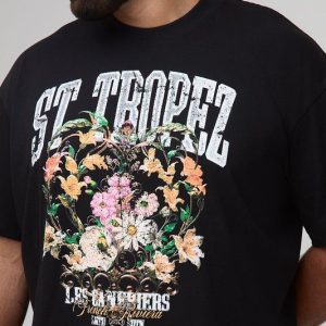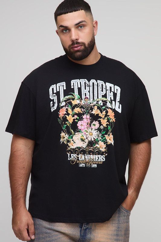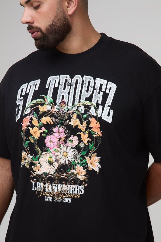 Plus Oversized Extended Neck St. Tropez Floral Print T-Shirt