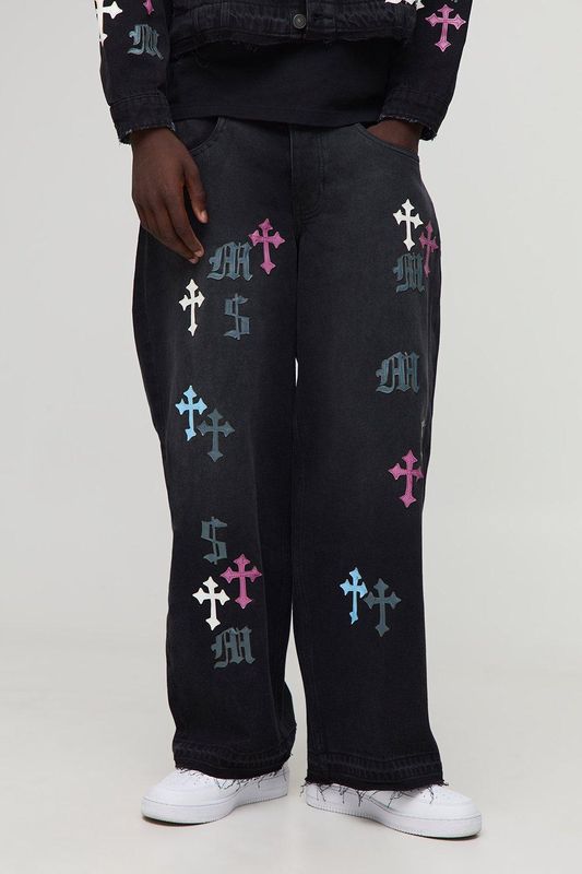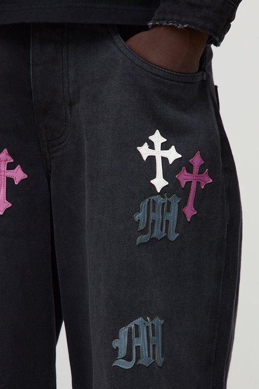 PU Applique Baggy Jeans