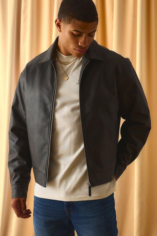 Regular Fit Antique PU Zip Up Harrington Jacket