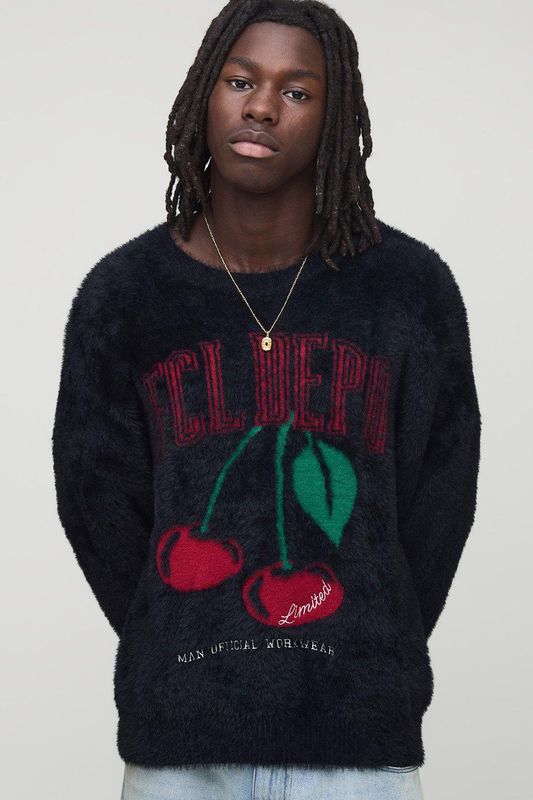 Regular Fit Cherry Graphic Extreme Fluffy Knitted Jumper