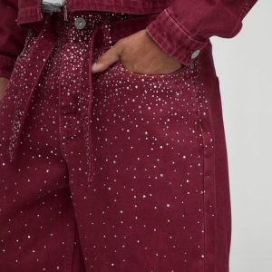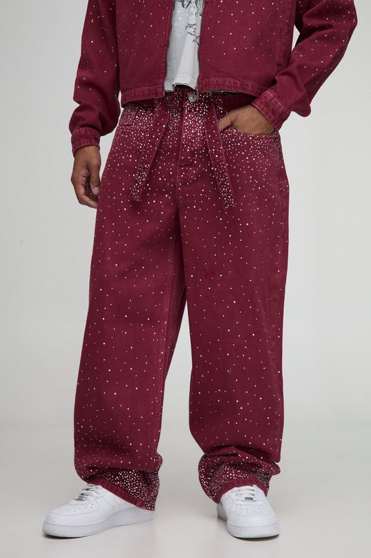 Relaxed Fit Belted Rhinestone Red Washed Jeans