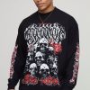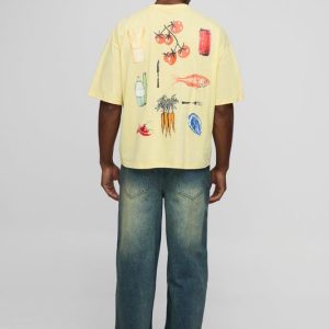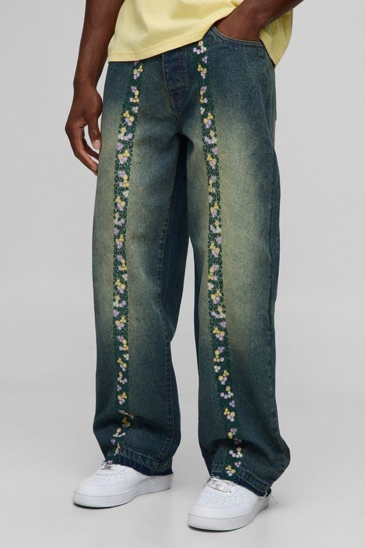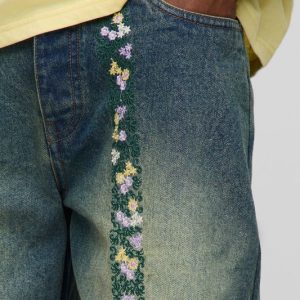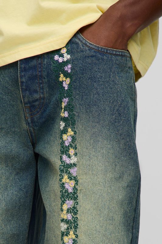 Relaxed Floral Embroidery Denim Jeans with Let Down Hem