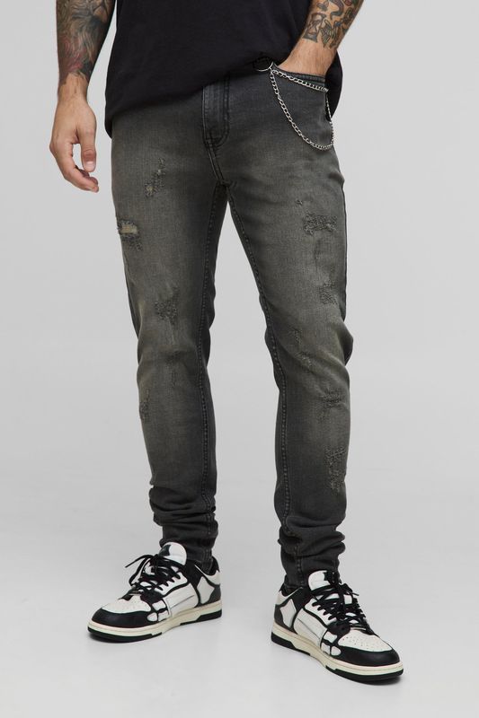 Skinny Stretch Distressed Washed Grey Jeans With Chain