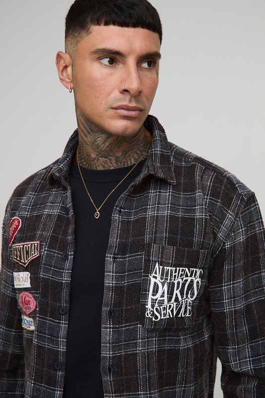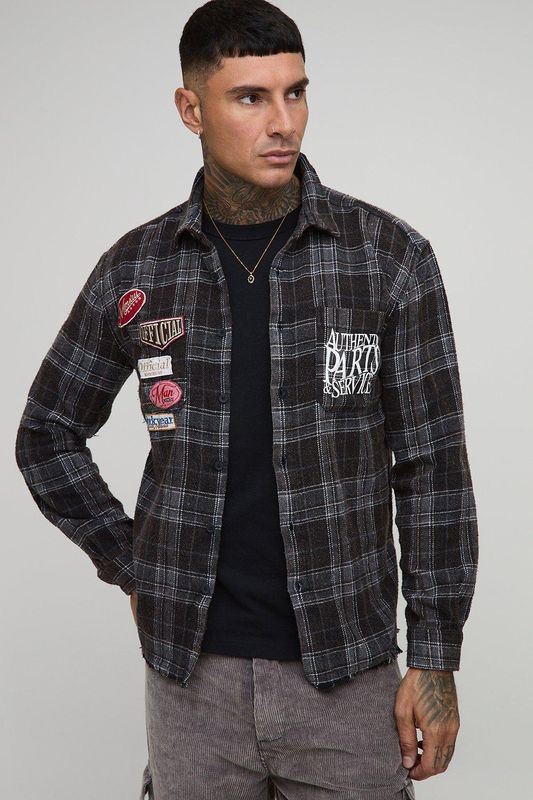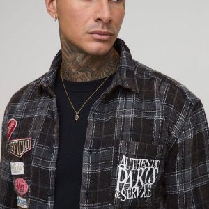 Tall Badge Detail Distressed Acid Wash Checked Shirt