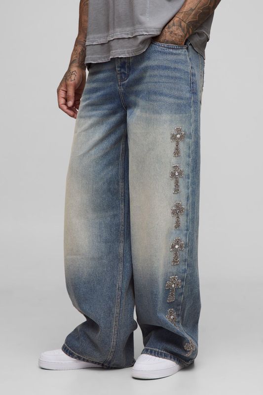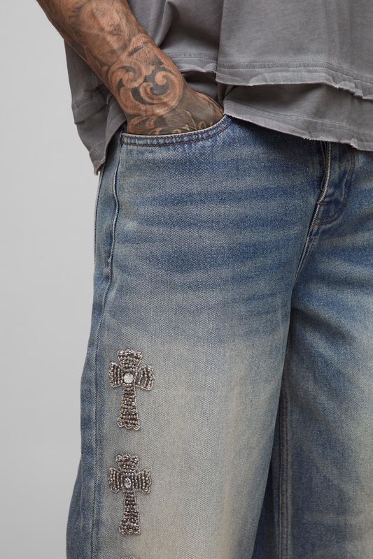 Tall Baggy Rigid Gothic Cross Embellished Jeans