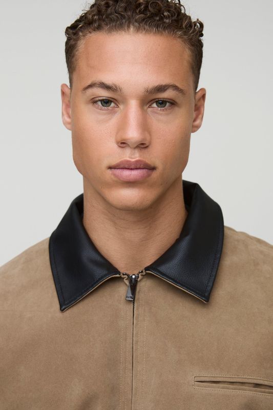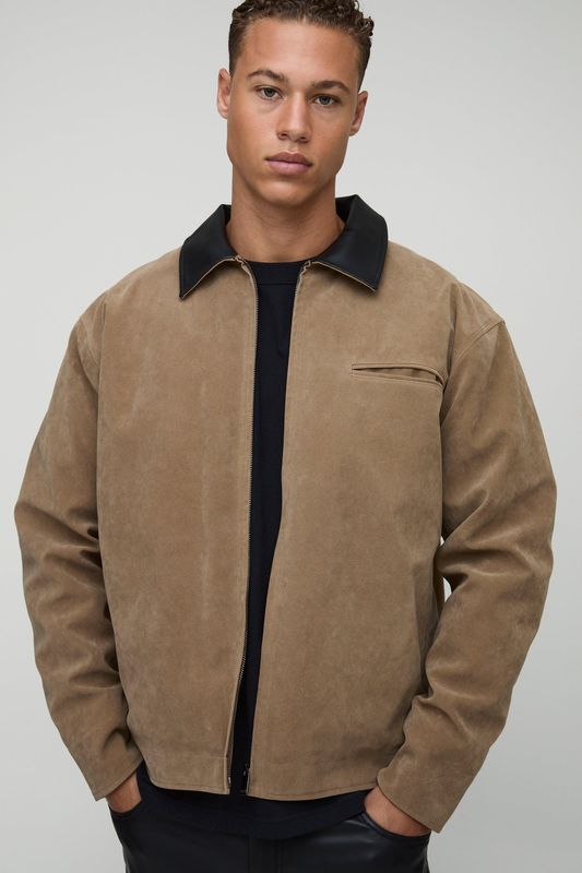 Tall Oversized Boxy Contrast Collar Faux Suede Harrington Jacket