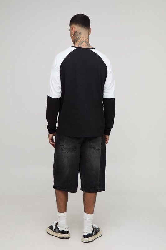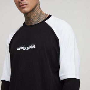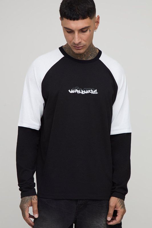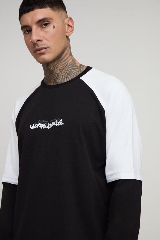Tall Oversized Boxy Faux Layer Embroidered Graphic Raglan T-Shirt