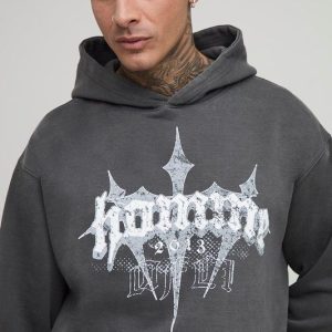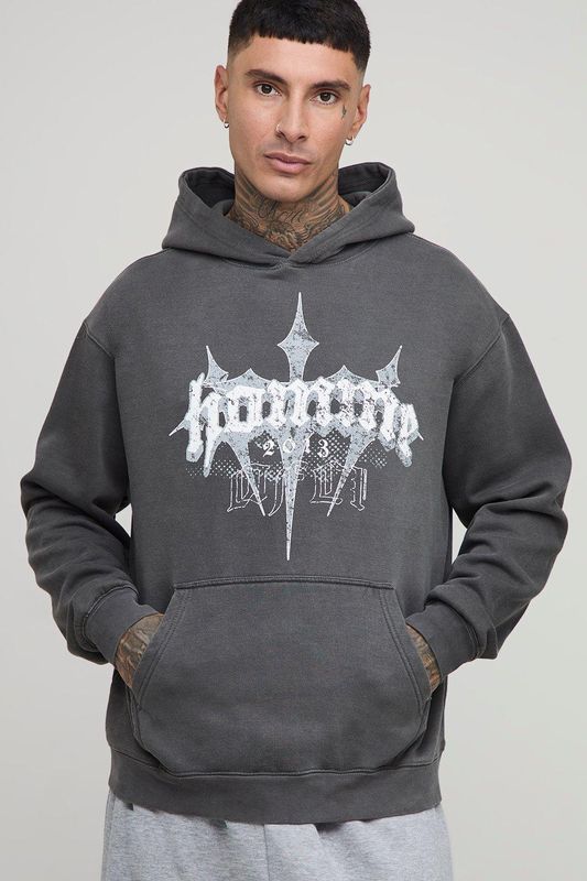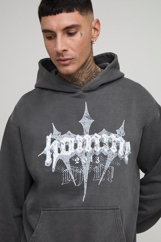 Tall Oversized Vintage Wash Homme Cross Print Hoodie