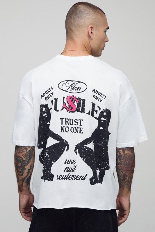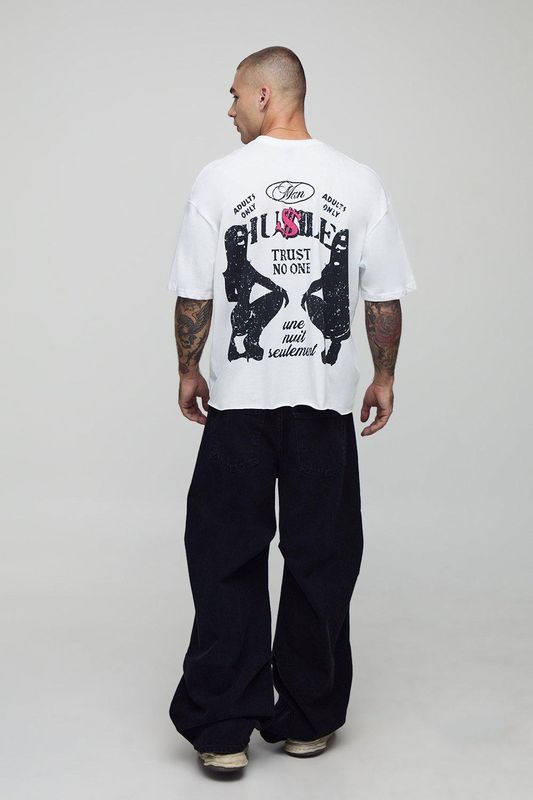 White Oversized Boxy Raw Hem Extended Neck Hustle Graphic T-Shirt