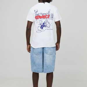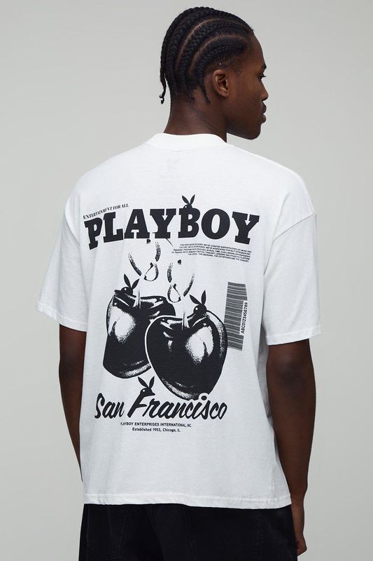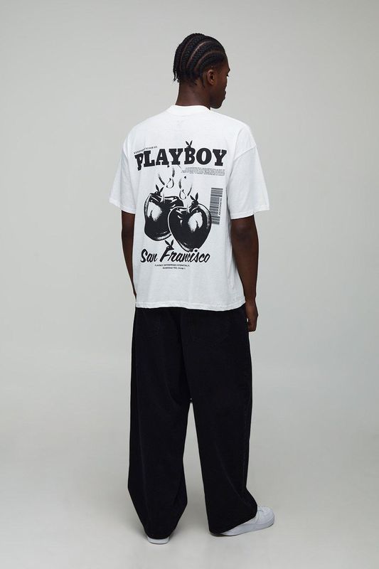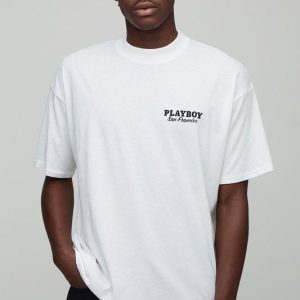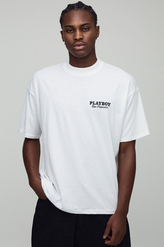 White Oversized Extended Neck Playboy License Printed T-Shirt